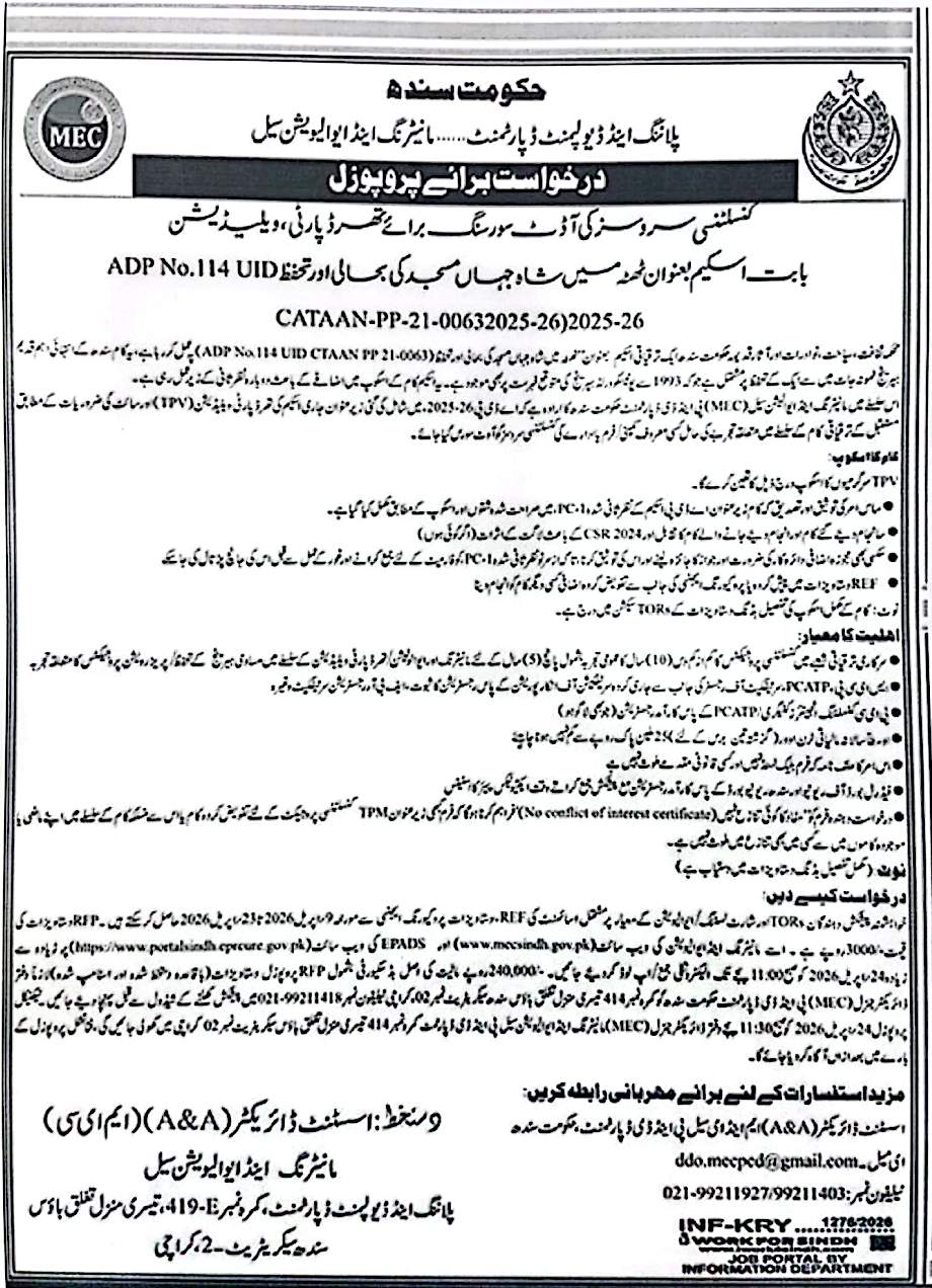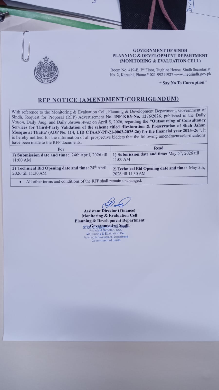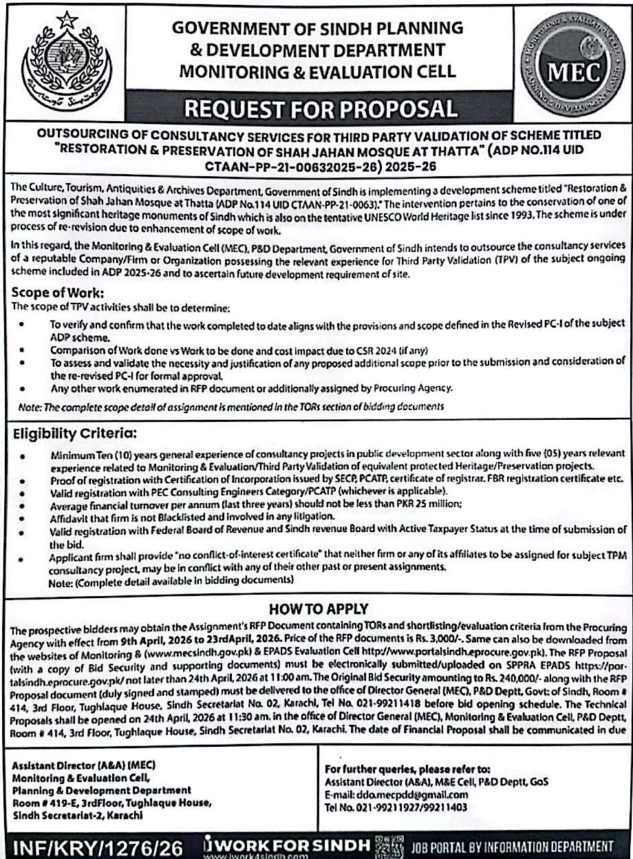 08-04-2026: Outsourcing of Consultancy Service for Third Party Validation of Scheme Titled "Restoration & Preservation of Shah Jahan Mosque at Thatta" (ADP # 114. UID CTAAN-PP-21-00632025-26) 2025-26